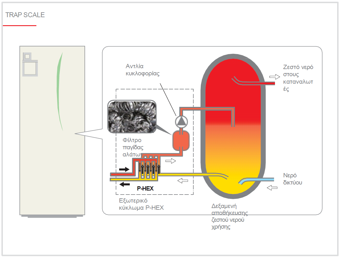 Χάρη στο συνδυασμό του πλακοειδούς εναλλάκτη θερμότητας και του μοναδικού φίλτρου "Scale Trap", η απόδοση του κύκλου ζεστού νερού χρήσης παραμένει αμετάβλητη με την πάροδο του χρόνου. Στα παραδοσιακά συστήματα, υπάρχει ο κίνδυνος καθίζησης και καθίζησης ασβεστίου στο εσωτερικό του εναλλάκτη, μειώνοντας την επιφάνεια ανταλλαγής. Το Hydrotank είναι εξοπλισμένο με το μοναδικό φίλτρο "Scale Trap", το οποίο συλλαμβάνει ομοιόμορφα το καθιζάνον ασβέστιο πριν αυτό προλάβει να κατακάτσει στον εναλλάκτη. Με αυτόν τον τρόπο, η ανταλλαγή θερμότητας διατηρείται, εξασφαλίζοντας υψηλή απόδοση για την παραγωγή ζεστού νερού χρήσης.
