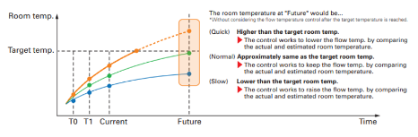 Η αυτοπροσαρμοζόμενη λειτουργία της Mitsubishi Electric ανιχνεύει τη θερμοκρασία του εσωτερικού και του εξωτερικού περιβάλλοντος και υπολογίζει τη ζήτηση θερμότητας που πρέπει να παρέχεται στον χώρο, εξασφαλίζοντας την παροχή της σωστής ποσότητας ενέργειας και αποφεύγοντας τη σπατάλη ενέργειας. Επιπλέον, εκτιμώντας δυναμικά τις μελλοντικές τάσεις της θερμοκρασίας του χώρου, το σύστημα αποφεύγει τις περιττές αυξήσεις της θερμοκρασίας παροχής- η εσωτερική θερμοκρασία μπορεί έτσι να διατηρηθεί σταθερή, αυξάνοντας την άνεση και εξοικονομώντας ενέργεια.